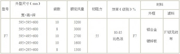 F7級(jí)袋式中效過濾器型號(hào)尺寸及其它參數(shù):