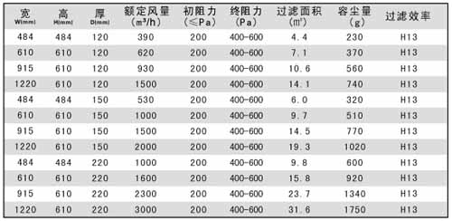 紙隔板高效過濾器規(guī)格尺寸及其它參數(shù):