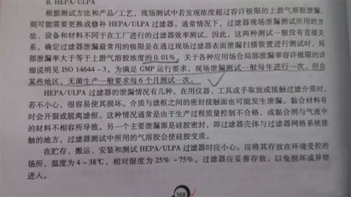 《藥品GMP指南》對(duì)檢測(cè)周期的規(guī)定:高效過(guò)濾器泄漏測(cè)試一般每年進(jìn)行一次,但無(wú)菌生產(chǎn)區(qū)每6個(gè)月測(cè)試一次。