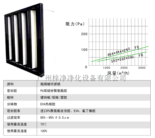濾料超細(xì)聚丙烯纖維,呈V型排列在一個(gè)非常緊密的聚苯烯或鋁合金的支撐外框內(nèi);