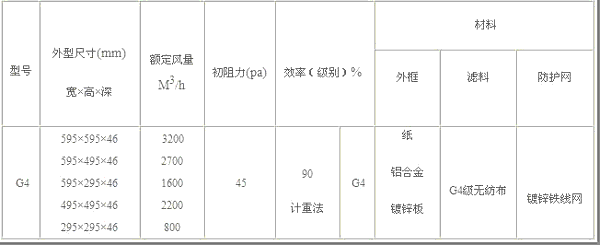 G4級板式初效過濾器規(guī)格尺寸技術(shù)參數(shù):